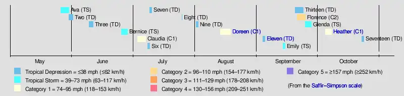 Despite the season featuring the lowest number of tropical storms on record at the time, there were numerous tropical depressions that failed to intensify into named storms. The first two tropical depressions existed from May 25–30 and from May 30–June 1, both west of the HondurasNicaragua border. Tropical depressions Six and Seven occurred in quick succession from July 8–9 and July 9–10, respectively. Tropical Depression Eight occurred solely on July 25, while Tropical Depression Nine existed from August 1–2. Yet another cyclone existed from September 3–4, while the seventeenth and final unnamed system formed on October 22 and dissipated on the next day.[7]