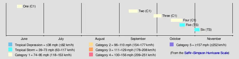 | 6 systems | June 10 – November 4 | 80 (130) | 985 | 2.5 | 112-275 | |||||