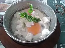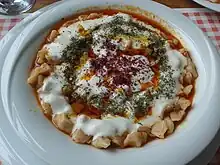 Yoğurt is an important element in Turkish cuisine.[4] In fact, the English word yogurt or yoghurt derives from the Turkish word yoğurt. Yoğurt can accompany almost all meat dishes (kebabs, köfte), vegetable dishes (especially fried eggplant, courgette, spinach with minced meat, etc.), meze and a specialty called mantı (folded triangles of dough containing minced meat). In villages, yoğurt is regularly eaten with pilav or bread. A thicker, higher-fat variety, süzme yoğurt or "strained yogurt", is made by straining the yoğurt curds from the whey. One of the most common Turkish drinks, ayran, is made from yoğurt. Also, yoğurt is often used in the preparation of cakes, some soups and pastries. Kashk is a fermented and strained sour yogurt that can be consumed on its own as a cheese, or used as an ingredient in soups.