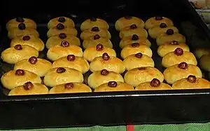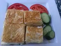 The use of layered dough is rooted in the nomadic character of early Central Asian Turks.[14][15][16] The combination of domed metal sač and oklava (the Turkish rod-style rolling pin) enabled the invention of the layered dough style used in börek (especially in Su Böreği, or 'water pastry', a salty baklava-like pastry with cheese filling), güllaç and baklava.[14][15][16]
