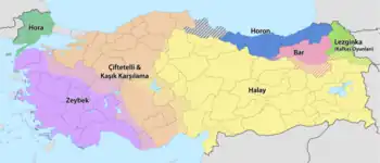 Turkish folk dances are the folk dances of Turkey. Facing three seas, straddling important trade routes, Turkey has a complex, sophisticated culture, reflected in the variety of its dances. The dominant dance forms are types of line dance. There are many different types of folk dances performed in various ways in Turkey. Zeybek, Teke Zortlatması in Aegean region, Bar in Erzurum province, Halay in the central, southern, eastern, and southeastern parts of the country, Hora in Thrace, Horon in the eastern Black Sea region, Spoon dances in and around Konya, and Lezginka in Kars and Ardahan are some of the best known examples of these.[1]