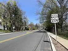 In Princeton, CR 533 intersects US 206, and the two routes form a concurrency.[1] The road becomes Stockton Street, passing by the Drumthwacket Governor's mansion. US 206 turns north onto Bayard Lane, with Route 27 continuing northeast into downtown Princeton on Nassau Street, which provides access to Princeton University through Princeton Downtown. The stretch from Lawrenceville until the intersection with Nassau Street in Princeton is part of the King's Highway Historic District. Bayard Lane carries the route past more wooded developed areas, eventually curving northeast through a park. Here, US 206 becomes State Road and turns north again.[1][3] Continuing to the north, the amount of development adjacent to the road decreases.[3]