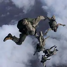This course instructs free fall parachuting (HALO) using a high performance parafoil. The course provides wind tunnel training, in-air instruction focusing on student stability, aerial maneuvers, air sense and parachute opening procedures. Each student undertakes a minimum of 30 free fall jumps including two day and two night jumps with supplemental oxygen, rucksack and load-bearing equipment.[25][21]
