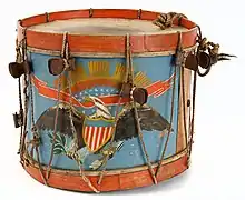 During the American Revolution, some military units, lacking heraldic insignia, painted eagles on the facing of their drums (in the British custom a regiment's armorial achievement would be used to decorate drums). This tradition continued after the war, and the decoration of drums with eagles in various poses, often dictated by the tastes of the individual band, continued.[22] By the War of 1812, eagles were required to be painted on a blue ground for infantry units and red for artillery, though the design of eagles remained a largely individual art.[22][23] Beginning in the 1840s, the U.S. Army attempted to standardize the eagles used on drums and, by the Civil War, stencils were issued to bands to apply the authorized designs, though some flair continued in the finishing and painting of the final product.[23][24] With the later establishment of the Army Institute of Heraldry, eagle drums were phased out in favor of drum designs emblazoned with distinctive unit insignia, a return to the British tradition.[22] Today, The U.S. Army Field Band and the U.S. Army Band "Pershing's Own" use "eagle drums".[22] Those drums feature an eagle design created by Gus Moeller known as "the Grand Republic".[25]