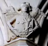Two sculpted angels on capitals of columns of arcade, St Matthew's Church, Cheriton Fitzpaine: left: holding an escutcheon showing the arms of Courtenay (Or, three torteaux), impaling A lion (lampago?) rampant guardant coward (unknown family); right: impaling in chief A lion (lampago?) passant guardant coward, (unknown family) and in base three birds (unknown family). The arms represent a member of the Courtenay family of Upcott and one of his wives, the other with two successive wives