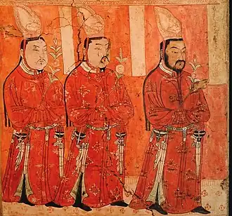 Uyghur princes wearing Chinese-styled robes and headgear. Bezeklik, Cave 9, 9–12th century CE.