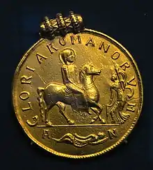 Medal of Valens showing the nimbate emperor on horseback, marked: gloria romanorum ("the Glory of the Romans") Later set in a pendant and found in the Șimleu Silvaniei, a hoard from the second quarter of the 5th century (Kunsthistorisches Museum)