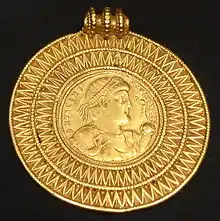 Obverse of a medal of Valens, set in a later pendant and found in the Șimleu Silvaniei, a hoard from the second quarter of the 5th century (Kunsthistorisches Museum)