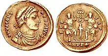Solidus of Valentinian I showing Valentinian and Gratian on the reverse, marked: victores augusti ("the Victors Augusti"). A palm bough is between them and Victory crowns each with a wreath