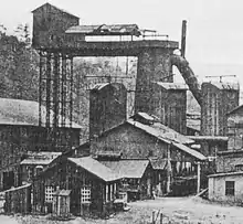 Detail of the Nittany Furnace, with the hoist and furnace (tallest) in back, then three stoves, and in front of them the boiler house.