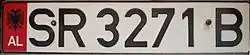 A new format similar to the post-1994 Italian and post-2009 French plate designs has been introduced since 16 February 2011.[1] The plates start with a blue strip at the left with 'AL' and redesigned double-headed eagle in white, 2 serial letters, security hologram, 3 digits, 2 serial letters on a rectangular white background, and end on the right with a blue strip that's supposed to show year of registration and regional code in white on. It has been observed that the last two identification elements are de facto not included while the font is more emphasized than the post-2002 one.[2] Plates of all vehicles would experience a similar change.[3] Critics claim that the color of the double headed eagle and strip is not representative of red and black colors of the Albanian flag.