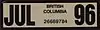 1938 | Embossed cream serial on brown plate with border line; "BRITISH COLUMBIA" at bottom and vertical "38" at right | none | 12-345 | 1 to approximately 97-000 | |