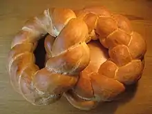 Vrtanek (also called perec) is a type of bread associated with Prekmurje, Slovenia. According to Protestant church reports dating to 1627 it was local custom for members of parish to give vrtanek as a gift for christenings and weddings. It was a typical feast food made for celebrations of the harvest.[1] The same braided, round loaf is recorded as torta panis in 1698. In modern times it's a festive loaf appropriate for many types of celebrations, public events and large receptions.[2]