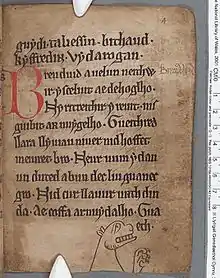 The southern and eastern parts of Great Britain lost to English settlement became known in Welsh as Lloegyr (Modern Welsh Lloegr), which may have referred to the kingdom of Mercia originally and which came to refer to England as a whole.[lower-alpha 4] The Germanic tribes who now dominated these lands were invariably called Saeson, meaning "Saxons". The Anglo-Saxons called the Romano-British *Walha, meaning 'Romanised foreigner' or 'stranger'.[50] The Welsh continued to call themselves Brythoniaid (Brythons or Britons) well into the Middle Ages, though the first written evidence of the use of Cymru and y Cymry is found in a praise poem to Cadwallon ap Cadfan (Moliant Cadwallon, by Afan Ferddig) c. 633.[15] In Armes Prydain, believed to be written around 930–942, the words Cymry and Cymro are used as often as 15 times.[51] However, from the Anglo-Saxon settlement onwards, the people gradually begin to adopt the name Cymry over Brythoniad.[52]