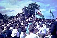 Plaid Cymru was formed in 1925, seeking greater autonomy or independence from the rest of the UK.[93] The term "England and Wales" became common for describing the area to which English law applied, and in 1955 Cardiff was proclaimed as Wales's capital. Cymdeithas yr Iaith Gymraeg (The Welsh Language Society) was formed in 1962, in response to fears that the language might soon die out.[94] Nationalist sentiment grew following the flooding of the Tryweryn valley in 1965 to create a reservoir to supply water to the English city of Liverpool.[95] Although 35 of the 36 Welsh MPs voted against the bill (one abstained), Parliament passed the bill and the village of Capel Celyn was submerged, highlighting Wales's powerlessness in her own affairs in the face of the numerical superiority of English MPs in Parliament.[96] Separatist groupings, such as the Free Wales Army and Mudiad Amddiffyn Cymru were formed, conducting campaigns from 1963.[97] Prior to the investiture of Charles in 1969, these groups were responsible for a number of bomb attacks on infrastructure.[98] At a by-election in 1966, Gwynfor Evans won the parliamentary seat of Carmarthen, Plaid Cymru's first Parliamentary seat.[99]