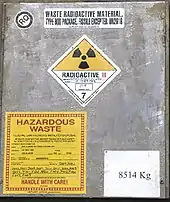 Waste that is to be disposed of at WIPP must meet certain "waste acceptance criteria".[51] It accepts transuranic waste generated from DOE activities. The waste must have radioactivity exceeding 100 nanocuries (3.7 kBq) per gram from TRUs that produce alpha radiation with a half life greater than 20 years. This criterion includes plutonium, uranium, americium, and neptunium among others. The WIPP must not act as disposal site for any high-level radioactive waste or any nuclear fuel that has already been used.[52] Mixed waste contains both radioactive and hazardous constituents, and WIPP first received mixed waste on September 9, 2000. Mixed waste is joint-regulated by the EPA and the New Mexico Environment Department.