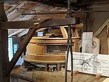 In 1726 it was decided to move the mill south, and it was moved again in 1790. The town granted permission for both moves and work to improve mill operation by a combination of a dam and roadway at its present site on Old Water Mill Road. First mill had an overshot wheel but at the dam site an undershot wheel was used. Archivists also unearthed evidence in the basement of the mill that suggested use at sometime in the past of a horizontal tub water wheel. The mill ownership changed thru the years. William Ludlam Sr. purchased it from Howell whom was a wealthy businessman with other interests in 1653 and it remained in the Ludlam family for over one hundred years. Subsequent owners Elias Petty, William Foster, Hugh Smith explored the industrial uses of the mill. Jesse hedges and John White also used its power to weave, full cloth and manufacture paper. John Benedict arrived in 1819 to work at the mill as a fuller, dyer and dresser of cloth. By 1833 he was the deeded owner. The Benedict family subsequently used the building for dyeing, spinning, weaving and fulling wool cloth. The mill still took grain in for grist. When the LIRR began operating nearby water to the mill was reduced, in 1892 the Benedicts installed a red windpump windmill to aid in grinding.[3] It was later removed.[4] By the early 1900s the mill was no longer a working concern. In 1921 the Ladies Auxiliary of Water Mill began leasing the building and make necessary repairs. Annual leasing ended in 1942 and they became owners of the mill. In 1968 the LAWM began restoring the mill as a museum. In 1976, the landmarked water-powered grist mill was working and able to replicate 18th century grinding methods.[5]