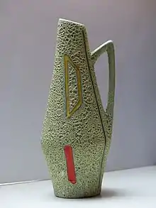 West German Art Pottery is essentially a term describing the time period of 1949–1990 and became the early way to describe the pottery because the country of origin, with numbers denoting the shape and size, was often the only "mark" on the base. Even though company names are now better known, and many items are attributed to specific makers, the more generic term "West German pottery" remains in common use. "Fat Lava" is a popular term that strictly refers to a fairly small subcategory of glazes but is all too often improperly used as a synonym for West German pottery. West Germany began in 1949: World War II ended in 1945, the next 4 years were the "zone" era with the country into the "US Zone", "Russian/Soviet Zone", "British Zone", and "French Zone", and it was 1949 when the East/West division replaced the zones.