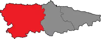 Western District is one of the three constituencies (Spanish: circunscripciones) represented in the General Junta of the Principality of Asturias, the regional legislature of the Principality of Asturias. The constituency currently elects six deputies. It comprises the municipalities of Allande, Belmonte de Miranda, Boal, Candamo, Cangas del Narcea, Castropol, Coaña, Cudillero, Degaña, El Franco, Grado, Grandas de Salime, Ibias, Illano, Muros del Nalón, Navia, Pesoz, Pravia, Salas, San Martín de Oscos, Santa Eulalia de Oscos, San Tirso de Abres, Somiedo, Tapia de Casariego, Taramundi, Teverga, Tineo, Valdés, Vegadeo, Villanueva de Oscos, Villayón and Yernes y Tameza. The electoral system uses the D'Hondt method and a closed-list proportional representation, with a minimum threshold of 3%.