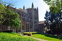 The Kerckhoff Marine Laboratory in Corona del Mar, Newport Beach is named in his honor, as are the "Max Planck Institute for Heart and Lung Research - W.G. Kerckhoff Institute" and the "Kerckhoff-Klinik" (a hospital for cardiology, cardiac surgery, pulmology, thoracic surgery, and rheumatology, affiliated with the University of Giessen School of Medicine and part of the William G. Kerckhoff Foundation), both in Bad Nauheim, Germany.[1] The William G. Kerckhoff Laboratories of the Biological Sciences at Caltech were built in 1928 to house the Institute's new biology division.[7] Kerckhoff Hall, designed by Allison & Allison, is home to various student media, clubs, and organizations on the UCLA campus.[8] It was the result of a US$815,000 ($100,000 for furnishing) donation from his widow Louisa.[9][10]