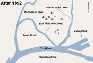 The final section passes through the Port of Melbourne and under the Bolte Bridge and the West Gate Bridge. The current course dates back to 1886 when a canal devised by British engineer Sir John Coode was cut from west of Flinders Street to below its junction with the Maribyrnong.[43] The resulting island between the new and old courses of the river was named Coode Island, and is now part of the mainland with the former course to the north filled in. The river flows into Port Phillip, the site being extensively altered as part of the Port of Melbourne, Australia's busiest seaport.
