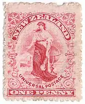 Zealandia also featured on one penny definitive postage stamps issued in 1901 and 1909 during the reign of Queen Victoria and Edward VII when it went from being a Colony to a Dominion and was also depicted on a stamp featuring the coat of arms issued in 1929.