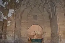 The building features a nine-layered conically-shaped muqarnas roof topped off with a cupola.[8] The inside room of the structure is about 3 meters long and about 7 meters wide. Beyond the entrance is a narrow staircase that leads to the grave room at the base of the minaret.[9] The roofing system of the mausoleum originated in a period in Islamic art in the 11th and 12th centuries. Sources state that this type of mosque and mausoleum might have originated in Iraq although there are similar structures in locations around regions of Iran.[8]